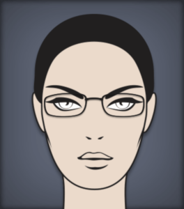 A square face is often characterized by a strong jaw line, a broad forehead, and a wide chin and cheekbones. The width and length of the face are close to being equal. Frames should be selected to make the face look longer and to soften the square angles of the face. Choose frames that are slightly curved (like an oval shape) and that have more horizontal than vertical real estate.